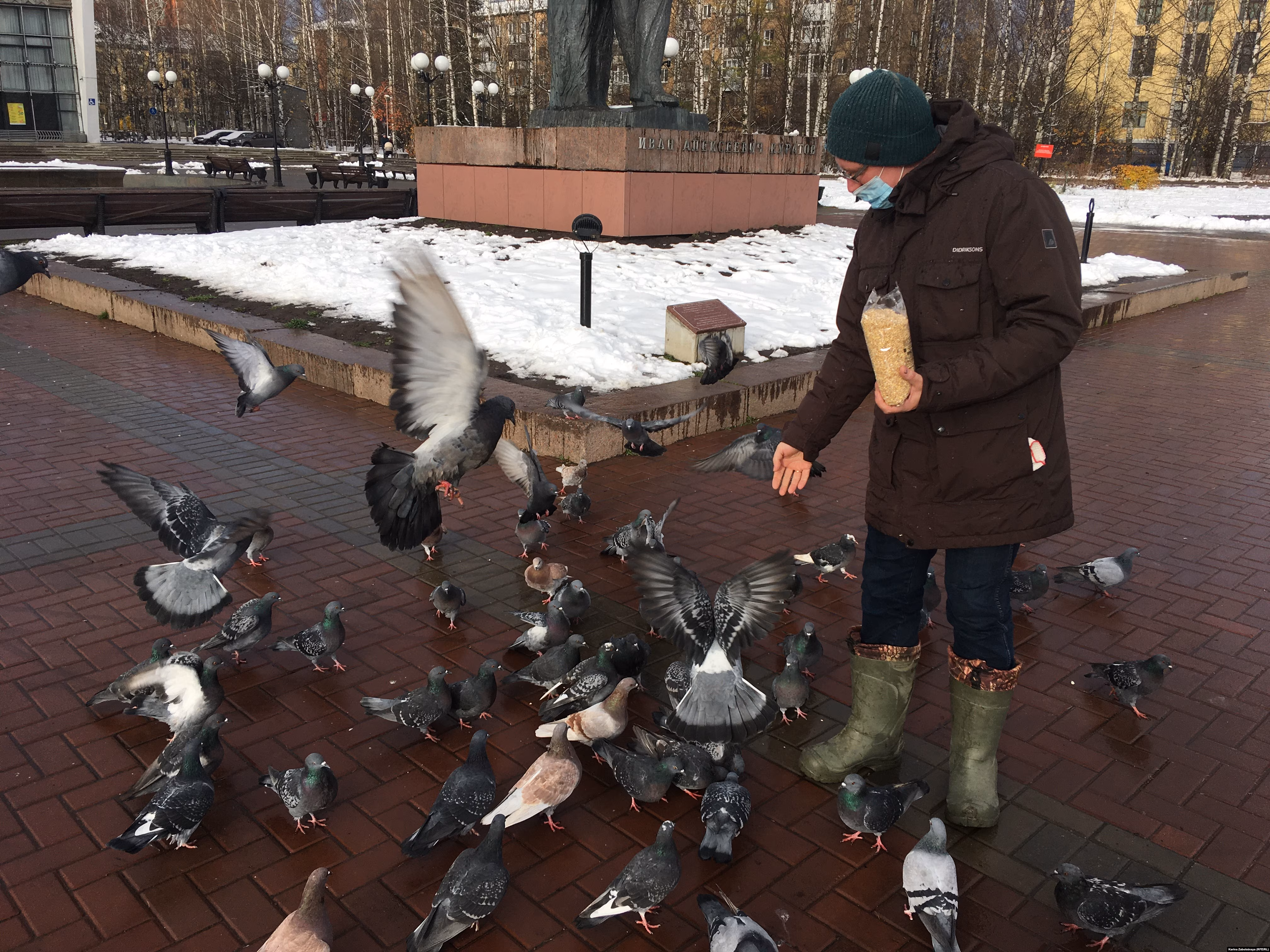 Тем временем другой мужчина, кормящий голубей, подошел к участнице акции.