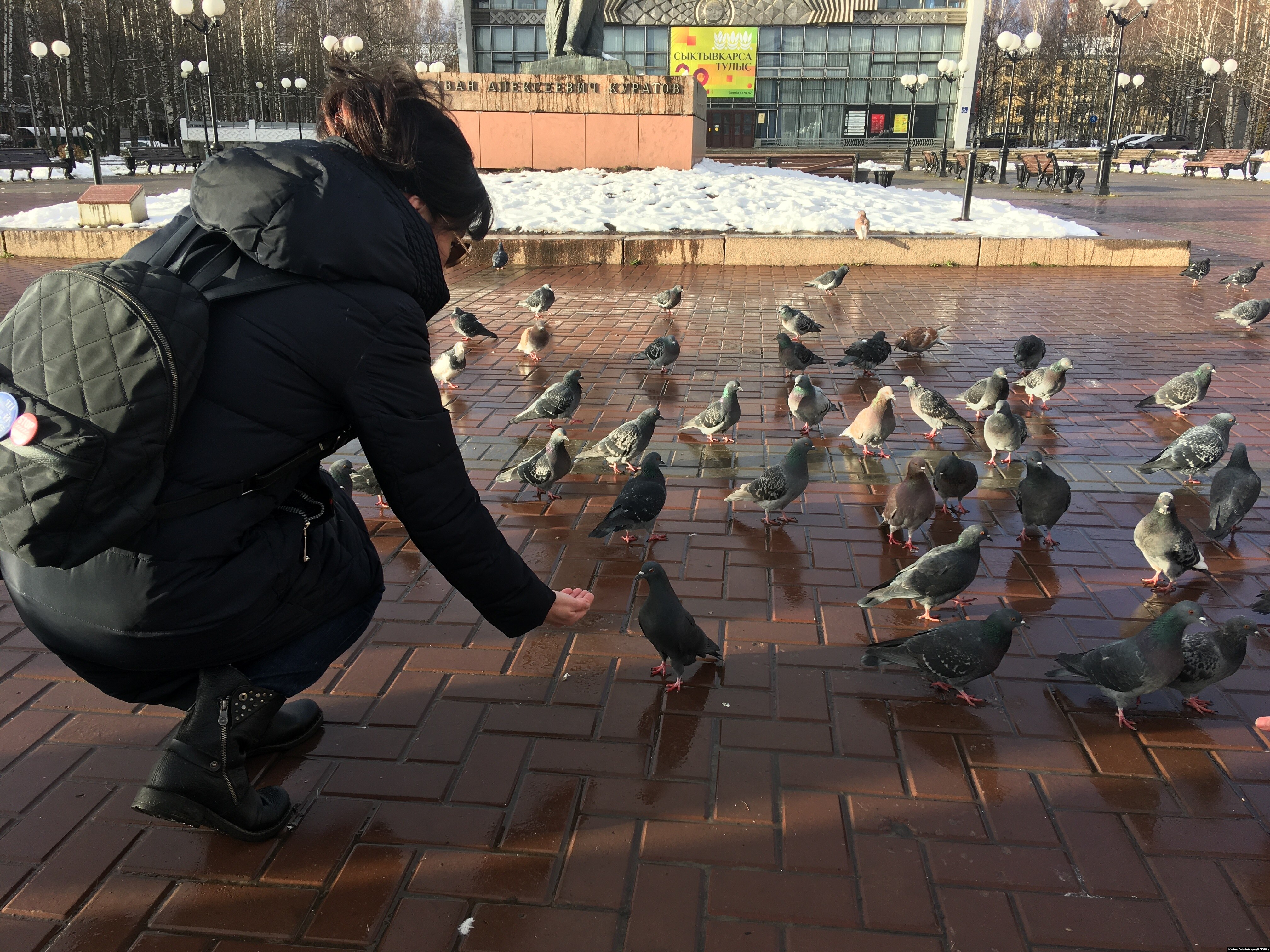 На площадь пришли восемь человек. Часть их них стояла в пикете, другие кормили голубей. За ними наблюдали сотрудники центра по борьбе с экстремизмом в штатском.