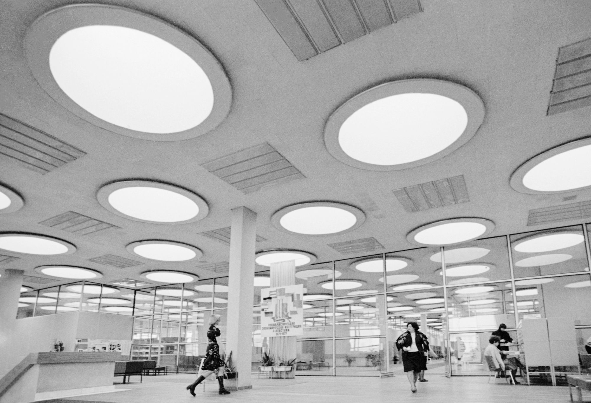 Здание ИНИОН вошло в этот список. Во-первых, оно должно было формировать ансамбль площади Иосипа Броз Тито, который сейчас, к сожалению, испорчен. Во-вторых, к тому времени внутри и снаружи библиотека идеально сохранилась. Конечно, были небольшие повреждения, но в целом здание дошло до наших дней в аутентичном виде. В-третьих, это работа известного архитектора Якова Белопольского — постройка очень эффектная сама по себе, особенно в сочетании с водоемом, который изначально там был. Здание перенимает принципы мировой архитектуры — например, зенитные фонари, которые изобрел и использовал Алвар Аалто в проекте выборгской библиотеки.
