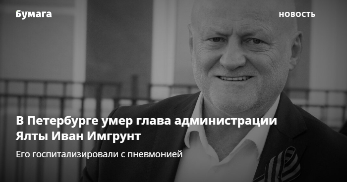 В Петербурге на 59-м году жизни скончался глава Ялты Иван Имгрунт. Об этом сообщает ТАСС.