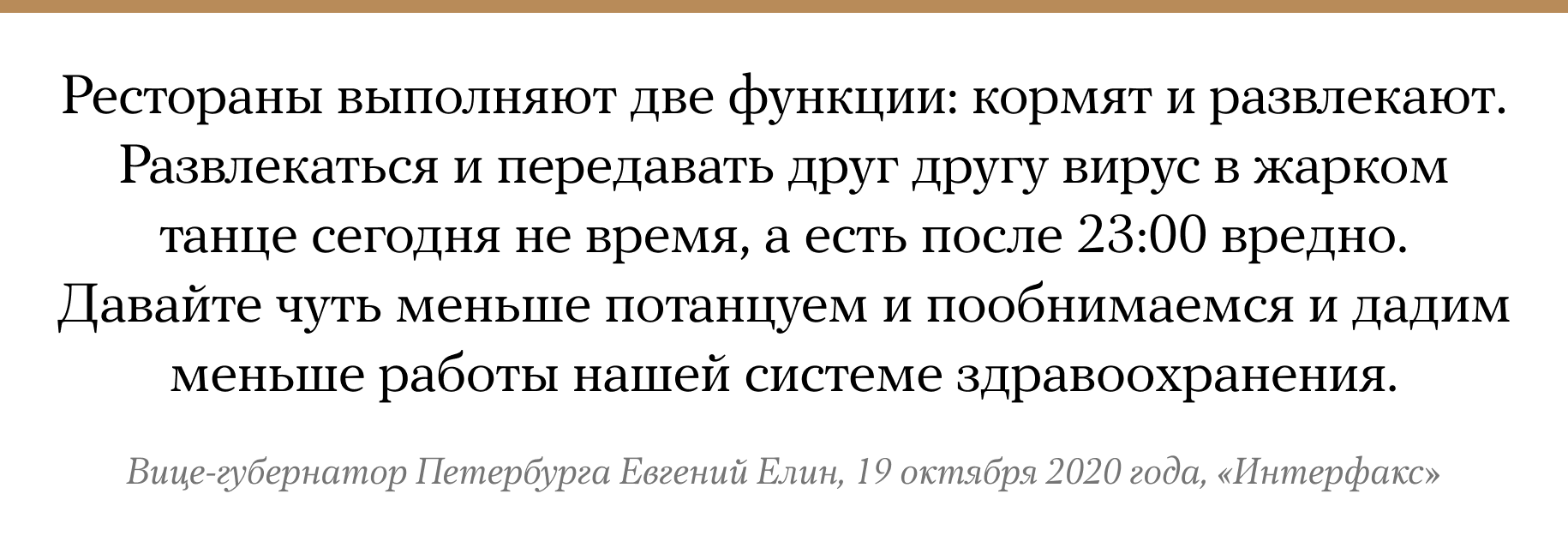 В Петербурге с 26 октября планируют ограничить работу ресторанов, баров и других предприятий общественного питания из-за пандемии коронавируса. Им запретят работать с 23 часов до 6 утра. Как сообщил вице-губернатор Петербурга Евгений Елин, прежде всего, ограничения затронут «ночную жизнь — дискотеки и караоке», которые работают под видом общепита.