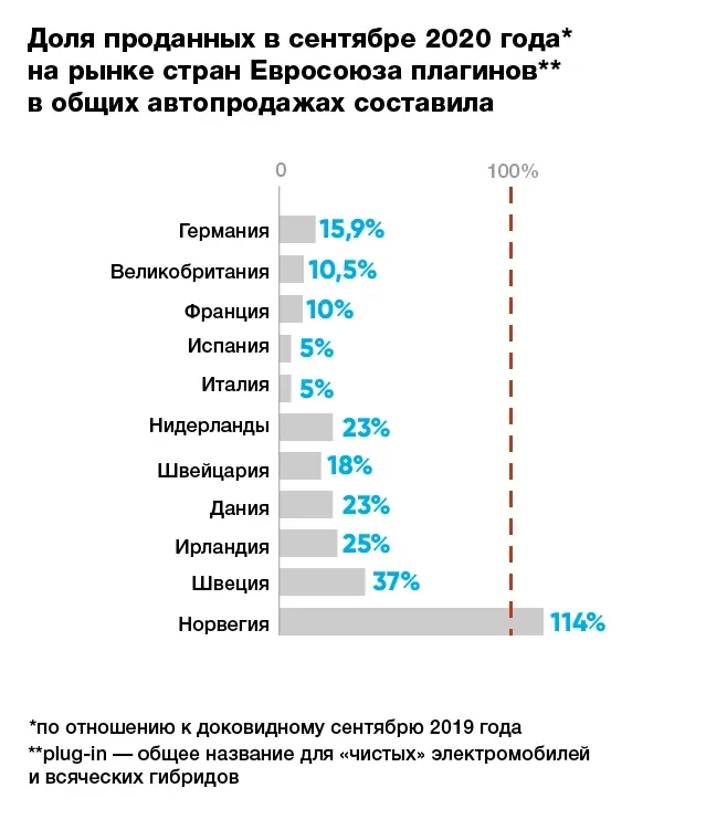 в сентябре этого года в Норвегии только плагинов продано на 14% больше, чем всех автомобилей в сентябре 2019 года;