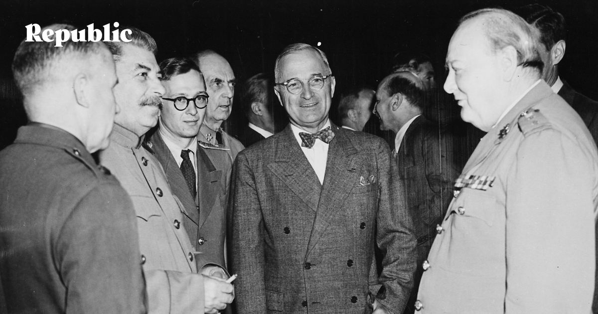 Сталин, Трумэн и Черчилль на Потсдамской конференции, июль 1945 года. Накануне саммита США провели первое испытание ядерного оружия. Вопреки популярным историческим мифам, Трумэн не приказывал провести это испытание, а Сталин не знал о нем заранее.