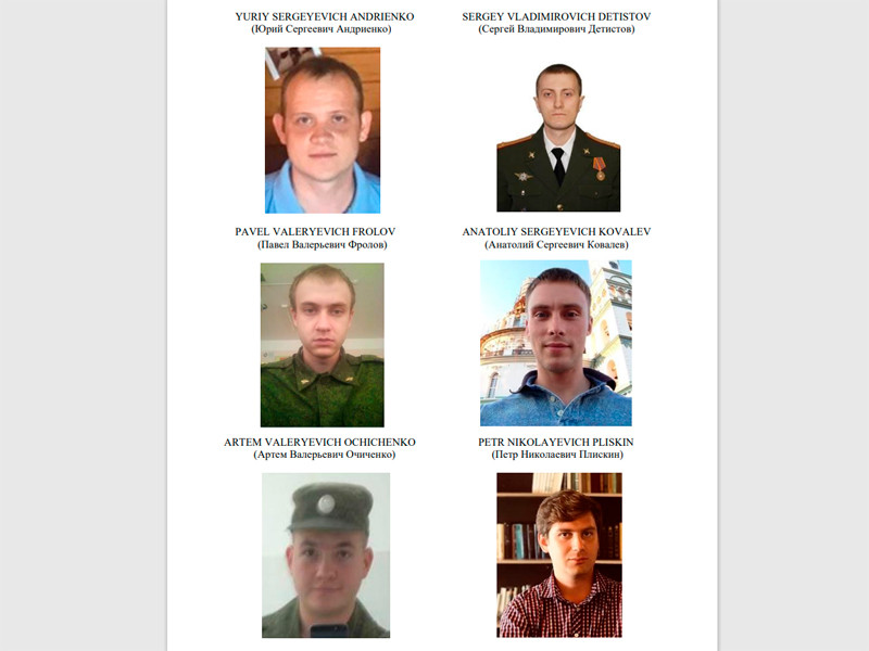 Обвинения предъявлены 32-летнему Юрию Сергеевичу Андриенко, 35-летнему Сергею Владимировичу Детистову, 28-летнему Павлу Валерьевичу Фролову, 29-летнему Анатолию Сергеевичу Ковалеву, 27-летнему Артему Валерьевичу Очиченко и 32-летнему Петру Николаевичу Плискину. По данным Минюста, все они являются военнослужащими войсковой части 74455 ГРУ, 12 сотрудников которой связывали со вмешательством в выборы президента США в 2016 году (среди них был и Ковалев).