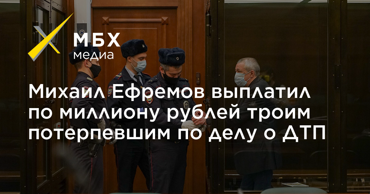 Актер Михаил Ефремов выплатил по миллиону рублей в качестве компенсации морального вреда еще троим потерпевшим по делу о ДТП, сообщил «МБХ медиа» адвокат Петр Хархорин.