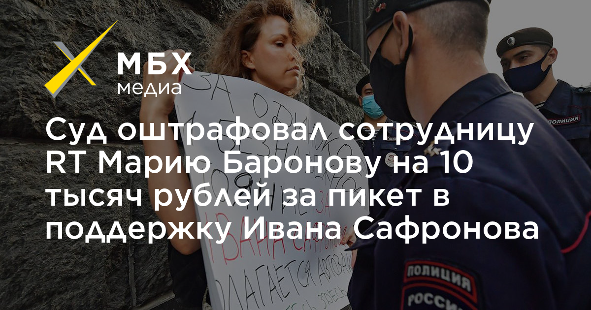 Мещанский суд Москвы оштрафовал сотрудницу RT Марию Баронову на 10 тысяч рублей за одиночный пикет в поддержку журналиста Ивана Сафронова 7 июля. Об этом сообщили «МБХ медиа» в пресс-службе суда.