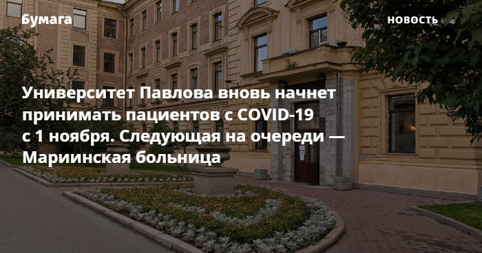Первый медицинский университет имени Павлова вновь начнет принимать пациентов с коронавирусом 1 ноября. Об этом сообщил ректор вуза Сергей Багненко в эфире канала «Санкт-Петербург».