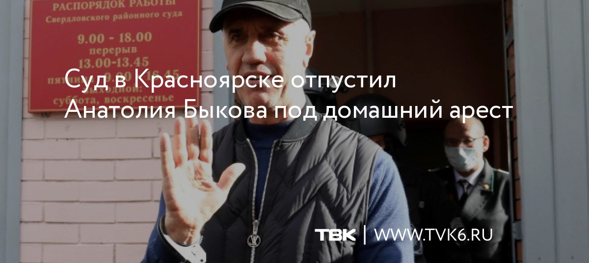 «Краевой суд на заседании по рассмотрению жалобы адвокатов бизнесмена А.П.Быкова на решение Железнодорожного районного суда Красноярска на заседании по вопросу меры пресечения в отношении Анатолия Петровича Быкова вынес решение об изменении меры пресечения в виде заключения под стражу на домашний арест с запретами на совершение определенных действий», – говорится в сообщении суда.
