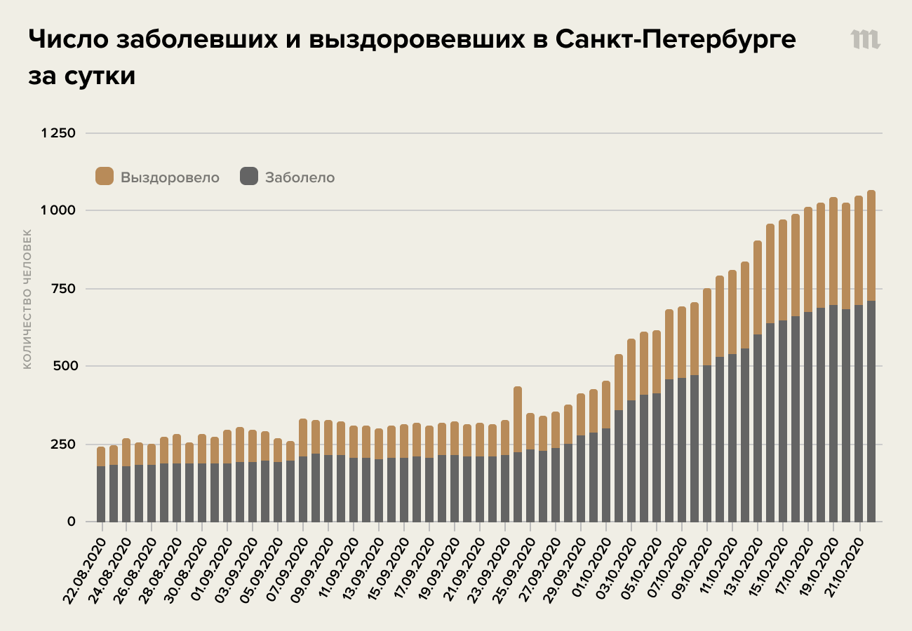 В Петербурге заболевает ровно в два раза больше людей, чем выздоравливает. Такого нет больше нигде. Об этой статистической аномалии в официальной статистике писали местные СМИ, но и после их публикаций ничего не изменилось. Такой паттерн наблюдается с середины сентября. Чтобы проверить расчеты властей, надо собрать данные по каждой больнице — и источник «Медузы» в одном из крупнейших стационаров говорит, что соотношение новых заболевших и выздоровевших в его больнице меняется каждый день.