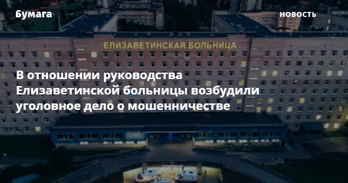 Следственный комитет возбудил уголовное дело о мошенничестве в отношении руководства Елизаветинской больницы. Об этом сообщает ТАСС со ссылкой на источник в правоохранительных органах, информацию «Фонтанке» подтвердили в пресс-службах медицинского учреждения и управления СК.