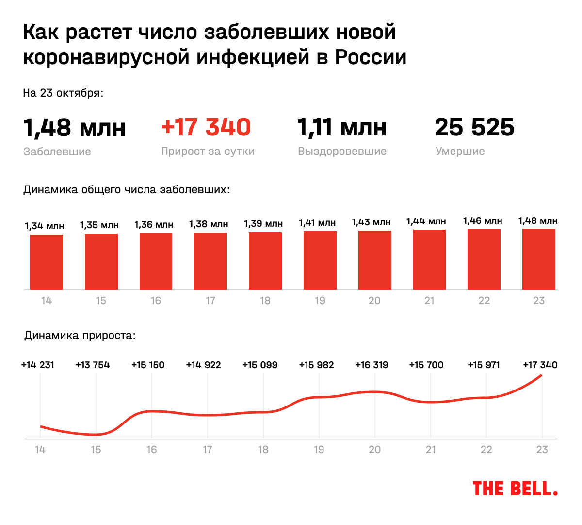 В России новый рекорд суточной заболеваемости коронавирусом — по официальным данным, за сутки к 23 октября выявлено 17 430 зараженных.