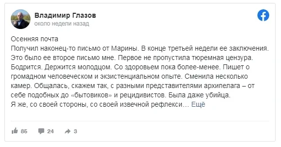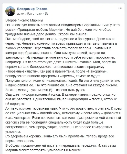 «Ее держат под следствием, уголовная статья 342, — продолжает Владимир. — В первом письме, которое я получил, Марина дала понять, что сразу, как только за ней пришли, ей сказали, что до суда не выпустят. Когда суд, неизвестно. Следствие может длиться два месяца, а там ещё продлят. Понятно, что письмо она писала с оглядкой. Все это прочитывается — на каждой странице стоит штамп. Описывала бытовые вещи. Написала, чем кормят — очень много углеводов, хочется фруктов. Вот пойду... передам передачу. Со здоровьем вроде все нормально. Как понял, самым тяжелым для нее стало то, что переводили из камеры в камеру. Только знакомишься, только подстраиваешься под одних людей, бац — тебя вырывают и ты подстраиваешься по новой. И в обычной жизни ведь так происходит, когда приходится менять один круг людей на абсолютно другой…»