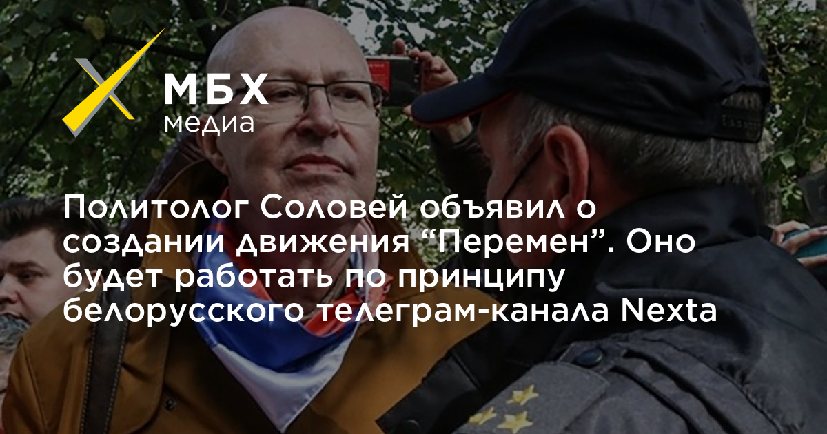 Политолог Валерий Соловей объявил о создании в России движения «Перемен», которое в организационном плане будет работать по принципу белорусского телеграм-канала Nexta. Об этом Соловей рассказал «МБХ медиа».