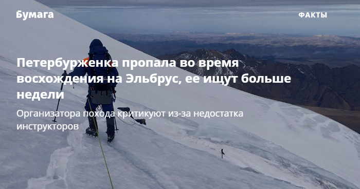 20 октября на северном склоне Эльбруса пропала петербурженка Екатерина Климовская. Она в составе коммерческой группы участвовала в походе от компании «Клуб приключений», центральный офис которой находится в Петербурге. Подъем был согласован с МЧС.