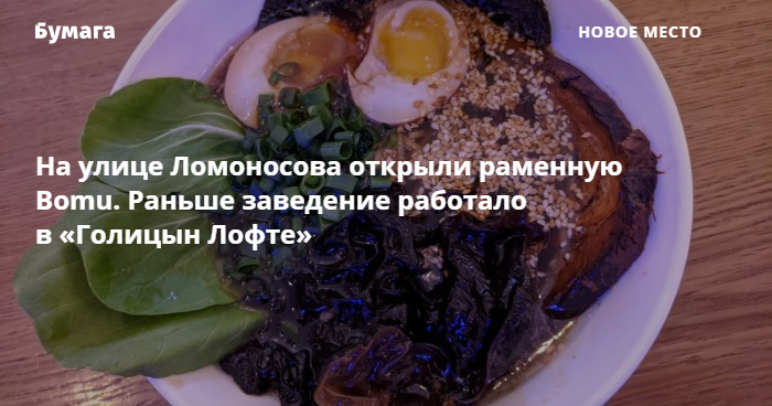 На улице Ломоносова, 26 — в помещении, которое раньше занимало Bao by Umao — открыли японское кафе Bomu, рассказали «Бумаге» представители заведения. Кафе переехало в эту локацию из кластера «Голицын Лофт», где оно работало около года.