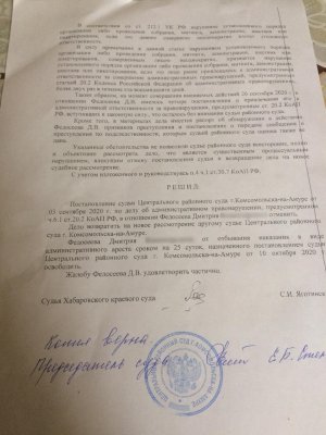 Хабаровский краевой суд 27 октября отменил арест на 25 суток участника акций в поддержку Фургала Дмитрия Федосеева. Суд отправил дело на новое рассмотрение и указал в решении (есть в распоряжении ОВД-Инфо), что первая инстанция не дала оценку сведениям о признаках преступления по «дадинской» статье о неоднократных нарушениях порядка проведения публичных мероприятий (ст. 212.1 УК).