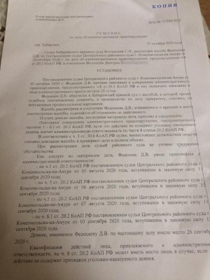 присудилВ суде Федосеев возражал, что эта футболка — его повседневная одежда, а 26 сентября он не участвовал в шествии, лишь прогуливался рядом. Однако суд Комсомольска-на-Амуре согласился с версией полицейских, принял во внимание три сентябрьские «административки» Федосеева по статьям об участии в несогласованных акциях (ч. 5 ст. 20.2 КоАП) — и признал его виновным в повторном нарушении на акции (ч. 8 ст. 20.2 КоАП).