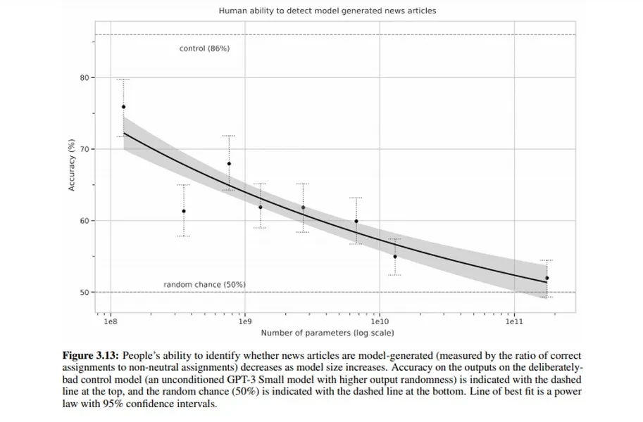 Согласно статистическим исследованиям, проведенным в процессе разработки и последующего тестирования GPT-3, вероятность распознавания природы текста (машина/человек) составила чуть больше 50%.