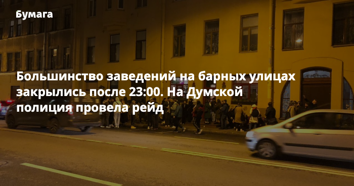 Большинство заведений на барных улицах Петербурга, в том числе на Рубинштейна и Некрасова, закрылись в 23:00, сообщают корреспонденты «Бумаги». Это первые выходные после вступления в силу нового запрета — Смольный ограничил работу кафе, ресторанов и другого общепита по ночам из-за ситуации с коронавирусом.