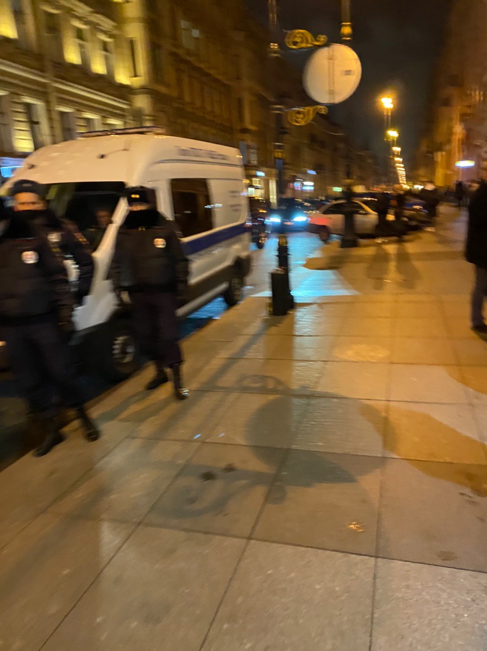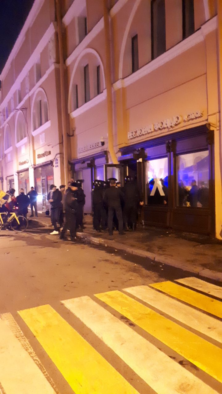 На улице Рубинштейна собрались десятки людей, многие в хеллоуинских костюмах. Там дежурила полицейская машина. На Думской организовали рейд, сотрудники полиции заходили в заведения и проверяли, работают ли они.