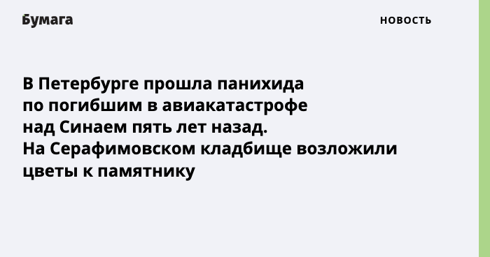 Кроме того, в Троицком соборе Петербурга прошла памятная панихида, посвященная пятой годовщине катастрофы. Она началась в 7:14 утра. В это время пять лет назад самолет не вышел на связь с аэропортом Ларнаки (Кипр), а его метка исчезла с экранов радаров.