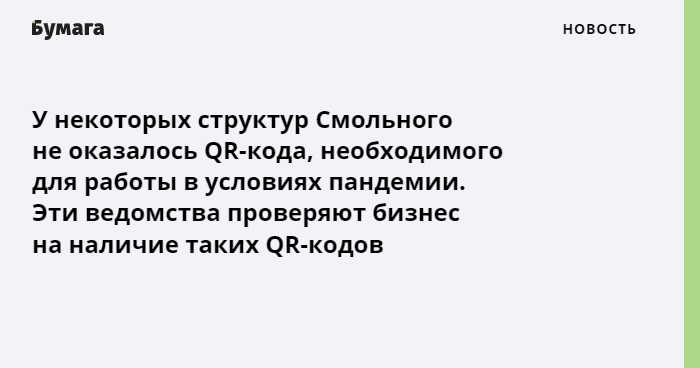 Несколько ведомств Смольного, проверяющих бизнес на соблюдение требований безопасности в условиях пандемии, сами не оформили QR-коды, подтверждающие, что они следуют стандартам безопасности. На это указали предприниматели во время онлайн-конференции Смольного с бизнесом, пишет «Фонтанка», информацию изданию частично подтвердили в комитете по промышленной политике.