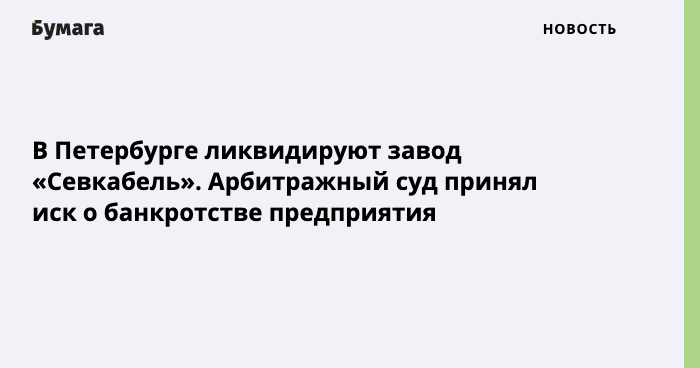В Петербурге могут ликвидировать кабельный завод «Севкабель». Арбитражный суд города принял к производству заявление банка «Траст» о банкротстве ООО «ПК „Севкабель“». Об этом сообщается на сайте арбитражного суда.