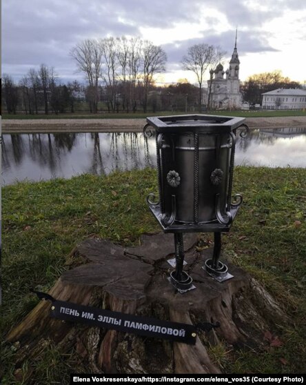 "Пень имени Памфиловой" был замечен в Вологде 1 ноября. Неизвестные поставили на старый пень серебристую урну и прикрепили табличку с именем главы Центральной избирательной комиссии.