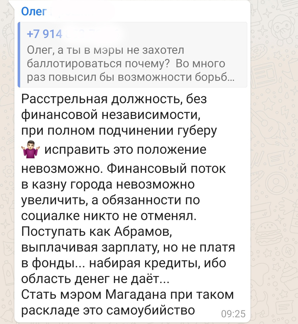 Кандидат социологических наук Олег Дудник работал в мэрии Магадана и входил в комиссию по отбору кандидатов на должность градоначальника на прошлых выборах. Он считает, что должность сегодня, по сути, свелась к работе завхоза, располагающего нищим бюджетом.