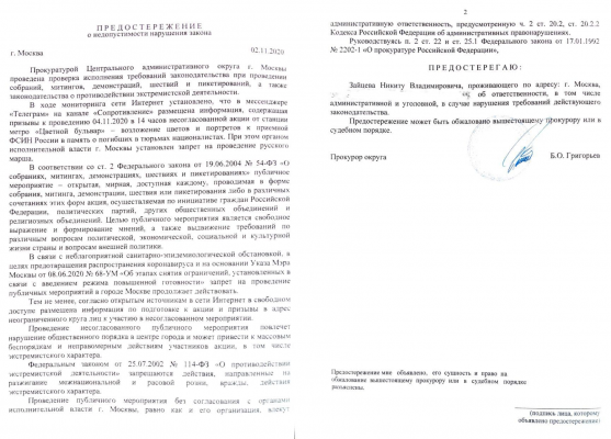 16:20 Никите Зайцеву, пресс-секретарю «Ассоциации народного сопротивления», вручили предостережение от прокурора Центрального административного округа Москвы. Об этом он сообщает в своем телеграм-канале.
