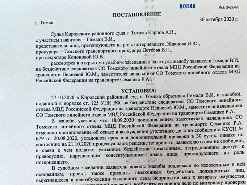 В ответ на требование Навального вернуть ему изъятые в ходе доследственной проверки вещи отмечается, что в УПК нет "императивной обязанности" следователя возвращать изъятые вещи одновременно с отказом в возбуждении уголовного дела. В итоге судья не усмотрел бездействия томских следователей, на которых жаловался Навальный.