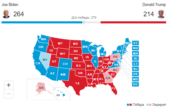 Тем не менее, накануне оба кандидата заявили о своей победе.На данный момент, Байдену не хватает 6 голосов выборщиков, чтобы стать президентом – за него проголосовало 264 выборщика, его конкурента выбрали 214. Подсчет голосов еще ведется в таких штатах, как Пенсильвания, Невада, Джорджия, Новая Каролина и Аляска – эти субъекты считаются колеблющимися, так как во многих других американцы обычно выбирают либо республиканцев, либо демократов, а в перечисленных – то одних, то других.