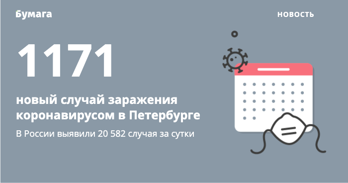 В России за последние сутки выявили 20 582 случая заражения коронавирусом, из них в Петербурге — 1171. Об этом сообщает оперштаб по борьбе с распространением инфекции.