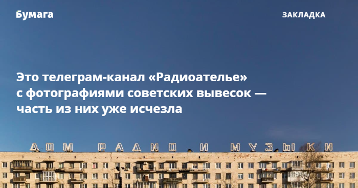 Разработчик «Бумаги» Никита Гранько с февраля 2020 года ведет в телеграме блог «Радиоателье». Там он выкладывает фотографии старых советских вывесок и рассказывает их истории.