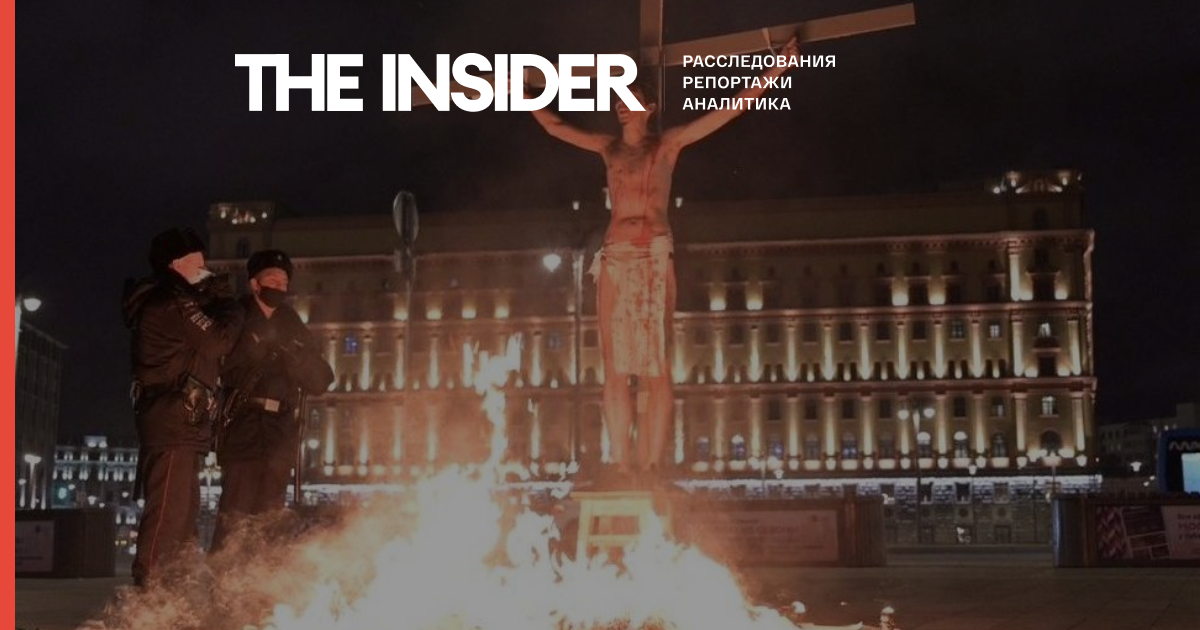 Крисевича в образе Иисуса Христа на кресте подожгли другие активисты, одетые в плащи с надписью ФСБ. Вокруг креста лежали горящие тома уголовных дел.