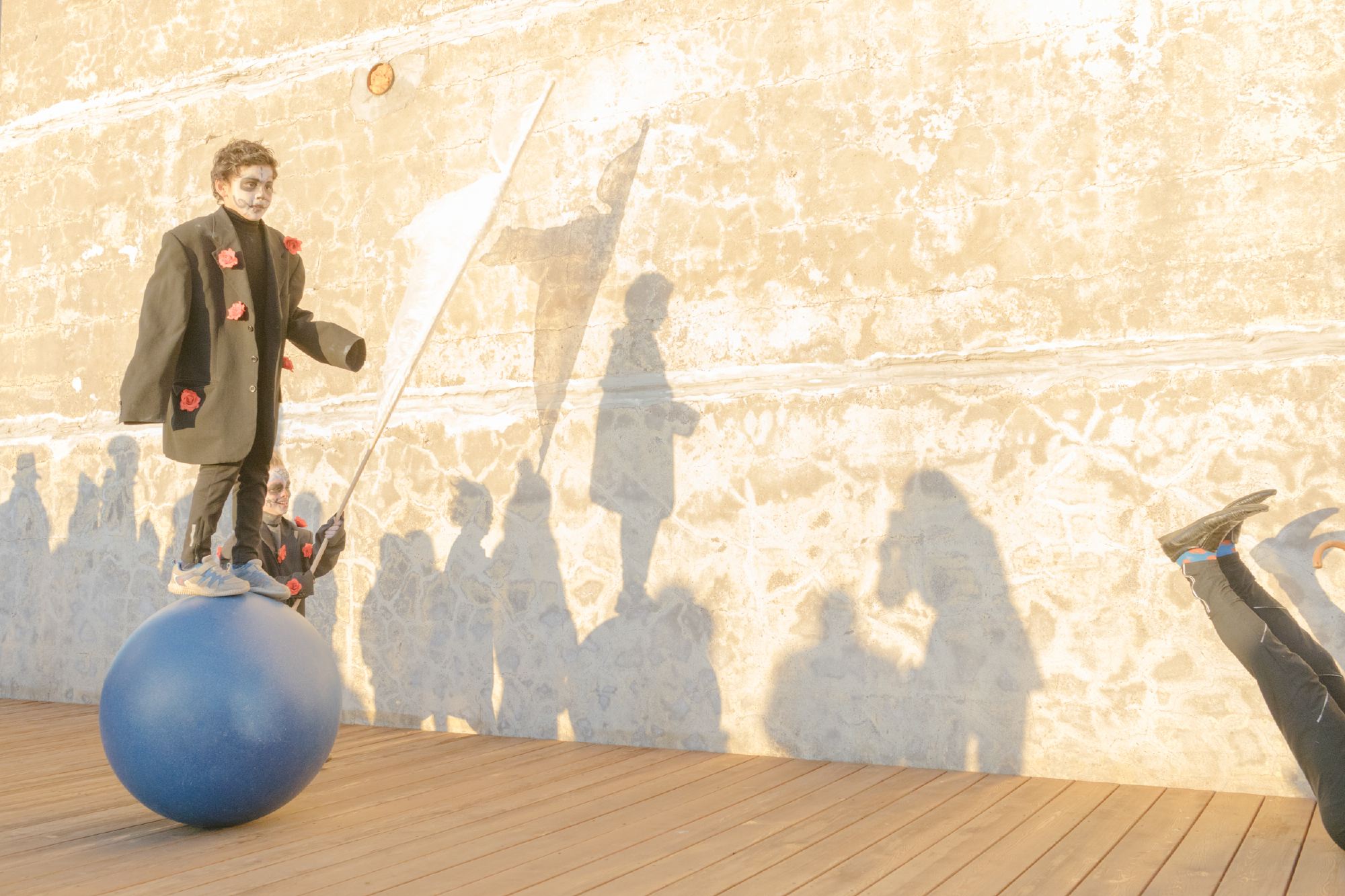 Ульяна сосредоточенно репетирует номер на арене цирка. Она подворачивает рукав огромного пиджака и на ходу балансирует длинную искусственную розу на кончике указательного пальца. Рома в это время носится по залу, безуспешно пытается крутить диаболо, кувыркается. Потом раскладывает маты в ряд, взбирается на синий шар чуть меньше метра в диаметре и медленно идет, перекатывая его ногами.