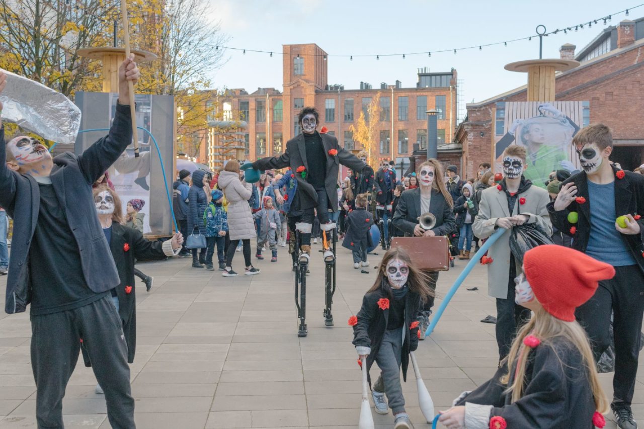 Помогаем Упсала-Цирк ПомочьПо тропинкам парка БЦ «Полюстрово» движется процессия. Прохожие останавливаются, смеются, кто-то начинает фотографировать. Шестнадцать детей от девяти до тринадцати лет в огромных, со взрослого плеча пиджаках, украшенных пластиковыми розами, идут друг за другом. Пятнадцать метров сплошного разброда и шатания. Из рук в руки переходит огромная зеленая портативная колонка с разбитной мексиканской музыкой; кто-то кувыркается, кто-то делает сальто, кто-то жонглирует, кто-то крутит диаболо, двое на ходулях, пятеро машут флагами, четверо несут мат, расписанный черепами и цветами, одна крохотная девчушка ловко прыгает через скакалку, маленький цирковой велосипедик размером с крупную кошку постоянно появляется то тут, то там и каждый раз с новым пассажиром.