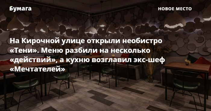 На Кирочной улице, 47 начало работу необистро «Тени», рассказали «Бумаге» представители заведения. Основателями заведения стали Александра Коткова и Сергей Курило, название места вдохновлено одноименной пьесой Михаила Салтыкова-Щедрина (до 1998 года Кирочная улица носила имя писателя).
