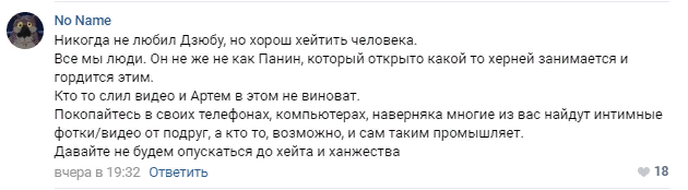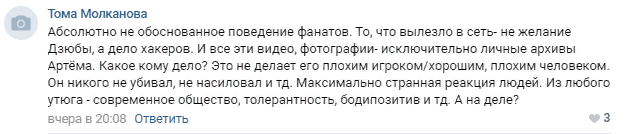 При этом многие медийные личности и болельщики поддержали Дзюбу, указывая на неприкосновенность личной жизни. В соцсетях запустили хештег в поддержку игрока, звезды вроде Андрея Малахова и актрисы Варвары Шмыковой опубликовали обнаженные фотографии в знак солидарности. Сам Дзюба забил победный гол сразу после слива видео, поблагодарил за поддержку и пообещал «не сломаться».