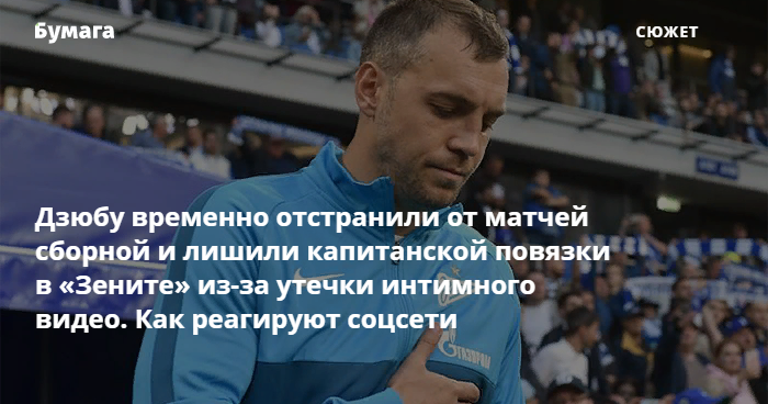 В соцсетях распространилось интимное видео Артема Дзюбы. Из-за этого футболиста не вызвали на ближайшие матчи сборной и лишили капитанской повязки в «Зените». На игре с «Краснодаром» его освистали болельщики.