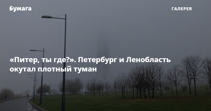 Днем 12 ноября на Петербург и часть Ленинградской области опустился плотный туман. Горожане жалуются, что не видят здания вдали. Некоторым даже сложно рассмотреть небоскреб «Лахта Центр». «Бумага» собрала фотографии тумана из соцсетей.