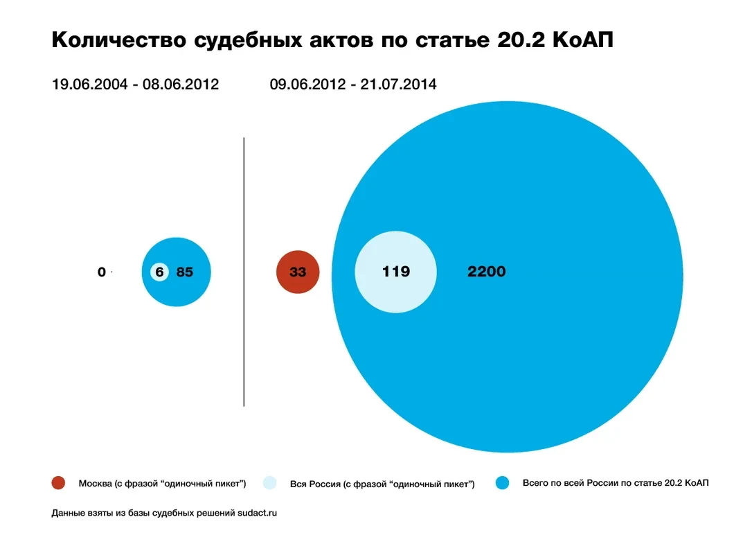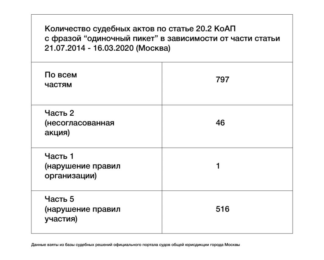 Из баз судебных решений — ГАС «Правосудие», «СудАкт», «Официальный портал судов общей юрисдикции города Москвы» — мы собрали постановления по статьям 20.2 и 20.6.1 КоАП, где присутствовала фраза «одиночный пикет». Выборочно было просмотрено около 500 дел.