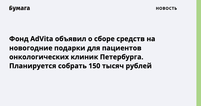 Благотворительный фонд AdVita объявил о сборе средств на новогодние подарки для пациентов онкологических клиник Петербурга