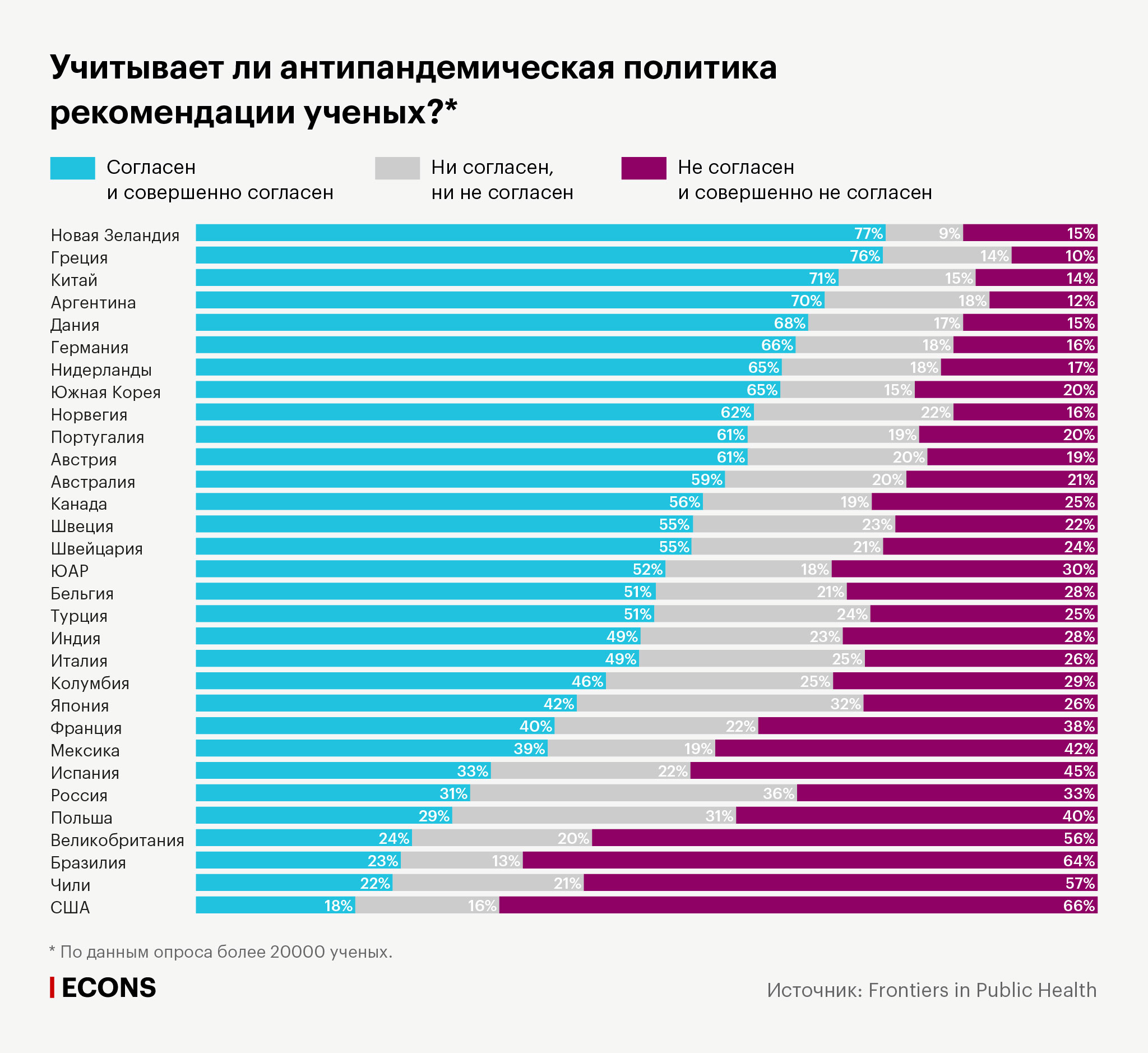 В том, что власти страны используют научный подход в борьбе с пандемией и смягчении ее последствий, сильнее всех уверены исследователи из Новой Зеландии. За последнюю неделю в стране регистрируется 3–6 новых случаев заболевания COVID-19 в день против более 80 на пике пандемии в конце марта — начале апреля. Премьер-министр Новой Зеландии Джасинда Ардерн стала самым популярным главой правительства в истории страны и одержала убедительную победу в выборах, состоявшихся в октябре 2020 года, набрав максимальное число голосов за всю историю выборов последних пяти десятков лет.