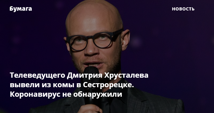 Телеведущего Дмитрия Хрусталева вывели из искусственной комы, коронавирус у него не обнаружили. Об этом пишет «Пятый канал» со ссылкой на менеджера артиста Анну Трегуб.