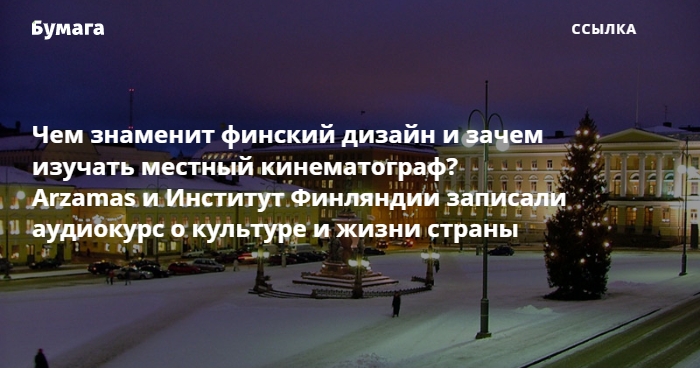 Arzamas и Институт Финляндии записали совместный аудиокурс о финской культуре. В шести бесплатных лекциях рассказывают о дизайне, архитектуре, музыке, кино, литературе и жизни «в самой счастливой стране мира».