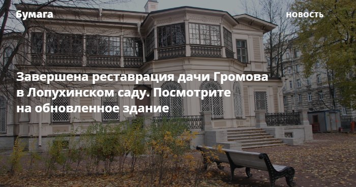 На реставрацию дачи Громова из бюджета города выделили 285 миллионов рублей. В здании откроется центр искусств Петроградского района.