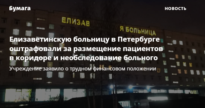 Защитник Елизаветинской больницы на суде вину признал, не оспаривая установленные нарушения. Он попросил судью учесть «трудное финансовое положение учреждения», из-за которого медики не могли исполнить требования в полном объеме.