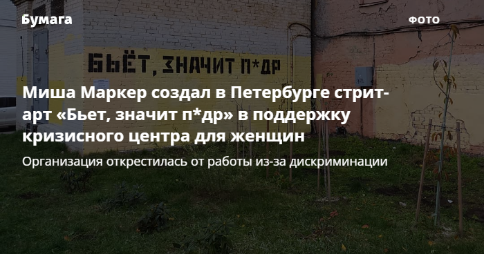 Уличный художник Миша Маркер создал в Петербурге стрит-арт с надписью «Бьет, значит п*др», направленный против домашнего насилия, с табличкой кризисного центра для женщин «ИНГО» рядом. Пост с работой опубликован в инстаграме Маркера.