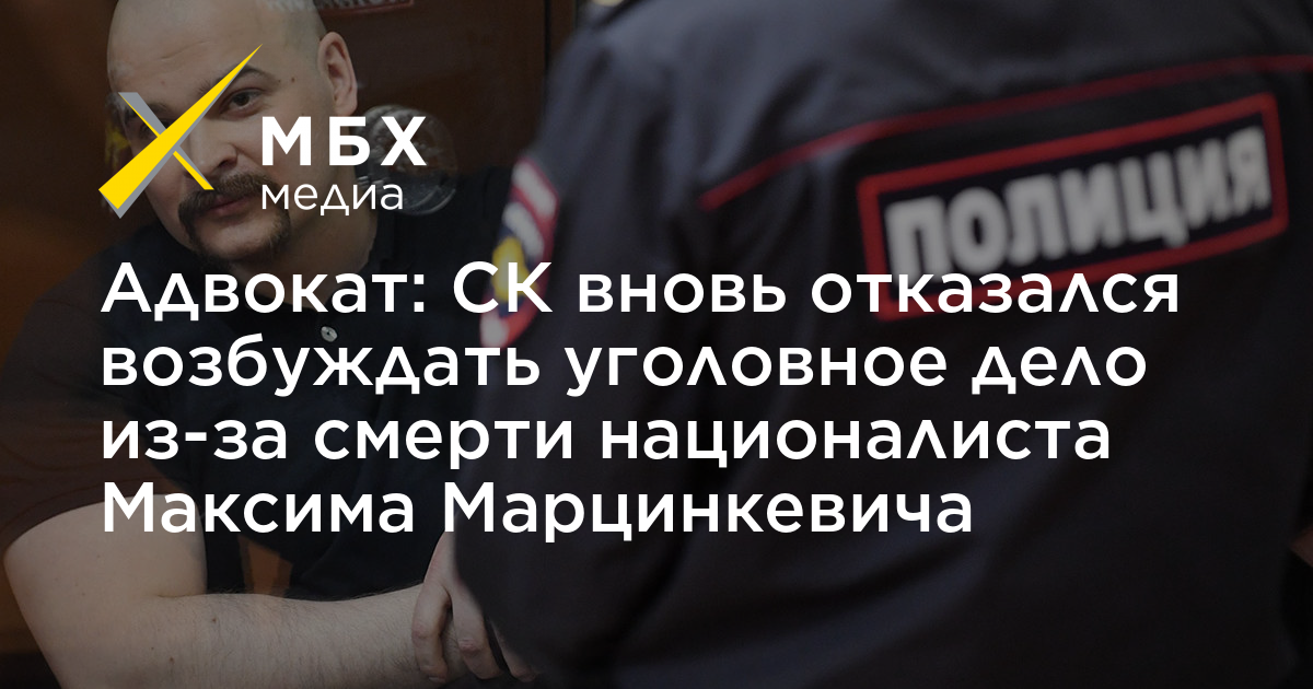 Следственный комитет по Челябинской области снова вынес постановление об отказе в возбуждении уголовного дела из-за смерти националиста Максима Марцинкевича. Об этом сообщил «МБХ медиа» адвокат Евгений Горошко.
